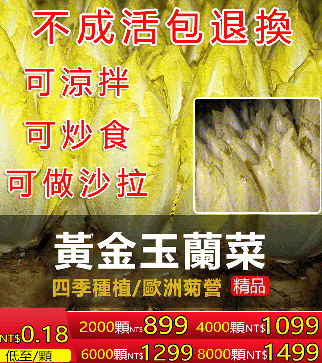 7分鐘前清脆可口的【黃金玉蘭菜】居然這麼簡單就可以種出來!生吃脆香甜,炒肉比肉鮮,輕輕鬆鬆幾個月就可以收穫,關鍵是年年可以割,年年可以長,年年有的吃 - 特大優惠!比利時「金玉蘭種子」4000顆(送狀根肥料)87%用戶的選擇!NT$1099